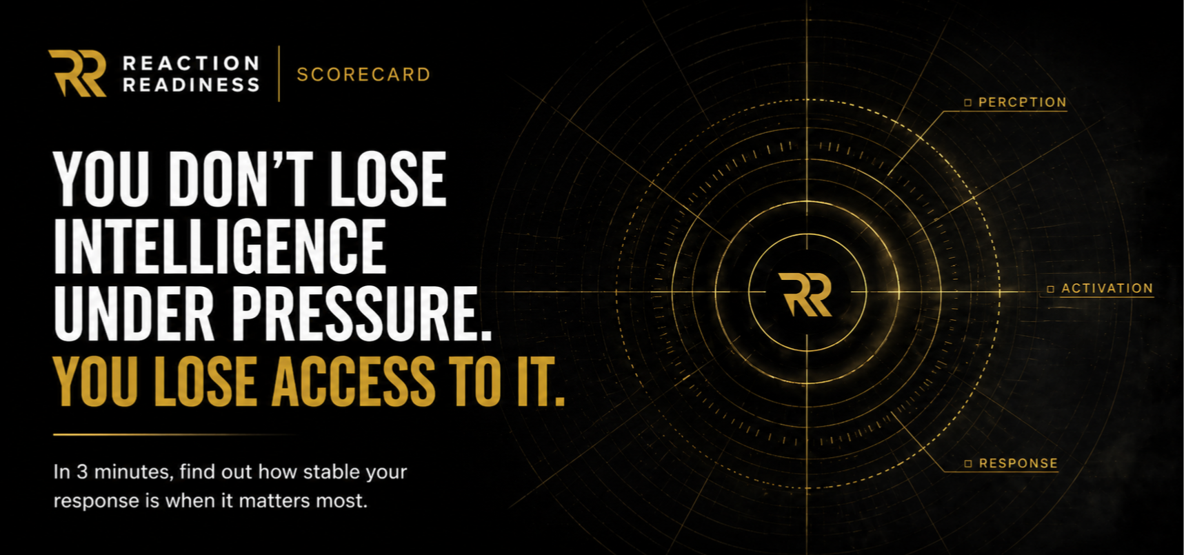 Reaction Readiness helps you understand how you respond when stress, urgency, or responsibility shows up — before clarity or alignment can be accessed. This 3-minute assessment helps you reflect on the reliability of your decision-making under pressure. It’s not a pass/fail test and it’s not a label — it’s a snapshot of your current patterns.